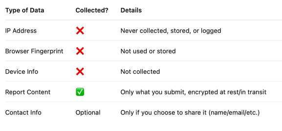 We collect no personal data by default. We do not log IP addresses, device identifiers, or metadata that could be used to reveal your identity.